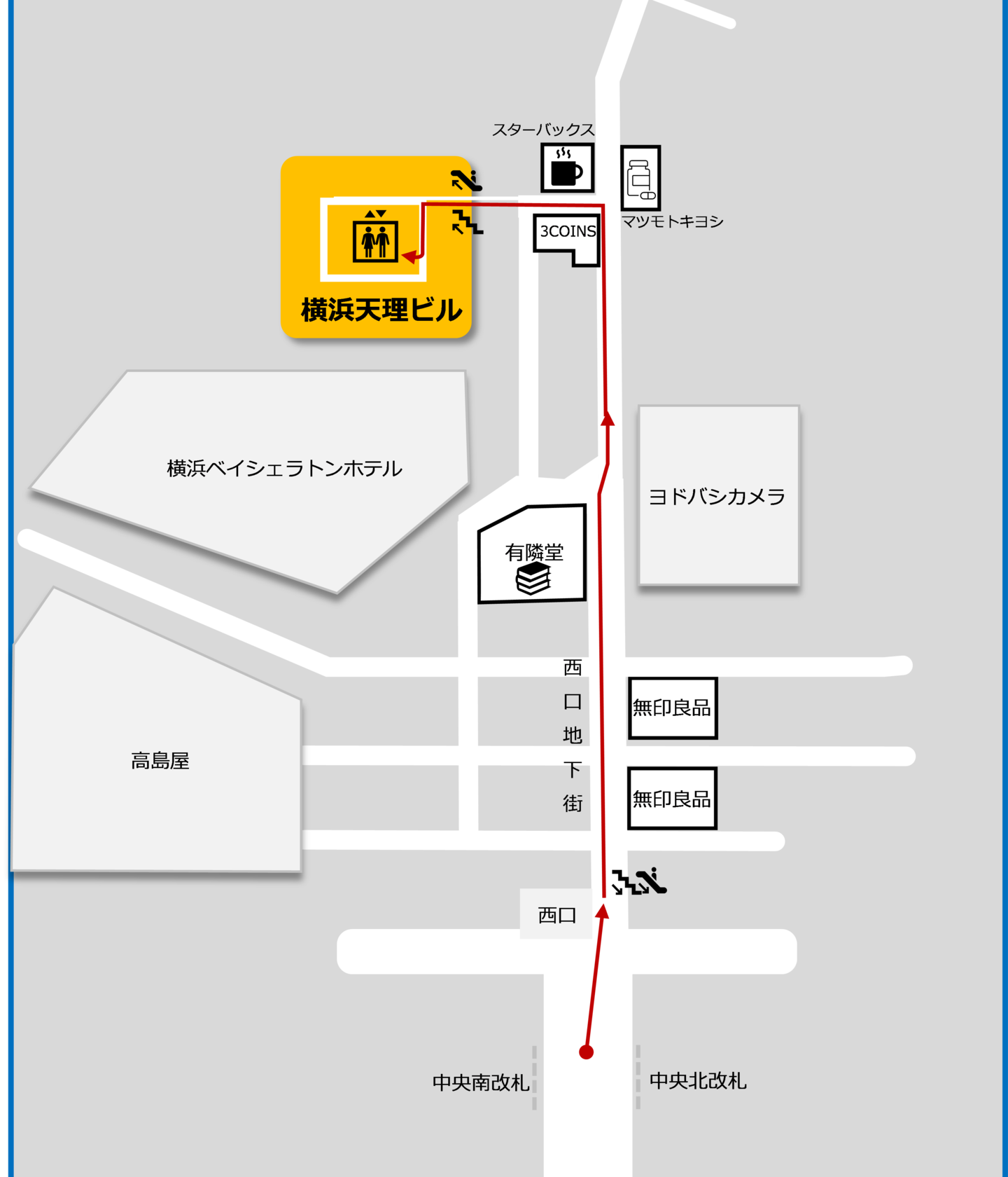 ①JR横浜駅の 「中央南改札」または「中央北改札」のどちらかから出ましょう。